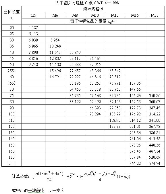 编者按86版紧固件有关国家标准不再含有紧固件重量部分,根据紧固件行业生产经营的需要,应部分紧固件厂商的要求,沈阳标准件研究所所长张金明结合多年从事紧固件生产技术的实验经验,对符合2004年底之前现行有效紧固件有关标准的产品重量,根据生产实际进行了理论重量公式推导,并且籍助于计算机功能较为准确的进行了理论重量计算。本刊自2005年第2期刊登以后,受到广大读者的好评。为了满足读者的要求,本刊将继续刊载供大家参考使用。